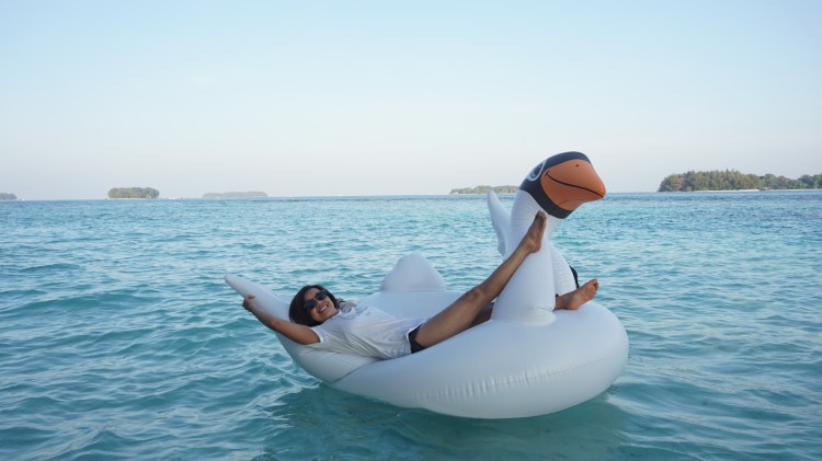 Beres dari Pulau Bintang, kami singgah ke Pulau Doplhin. Dimana wisatawan lain juga singgah santai disini. Main floaties yang sudah disediakan, main di air yang jernih. Makan indomie dan minum air kelapa fresh dari batoknya. Pulau Dolphin ini dikelola oleh ANCOL, kondisinya sangat bersih dan terawat. Bagus banget buat santai santai.